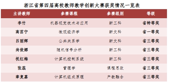 4月21日,由浙江省教育厅指导、省高等教育学会主办的浙江省第四届高校教师教学创新大赛在浙江工业大学圆满落幕。我校获特等奖1项、一等奖1项、三等奖5项和优秀组织奖,获奖数量再创新高。其中,电子信息学院李竹团队将代表浙江省参加在电子科技大学举办的第四届全国教师教学创新大赛。