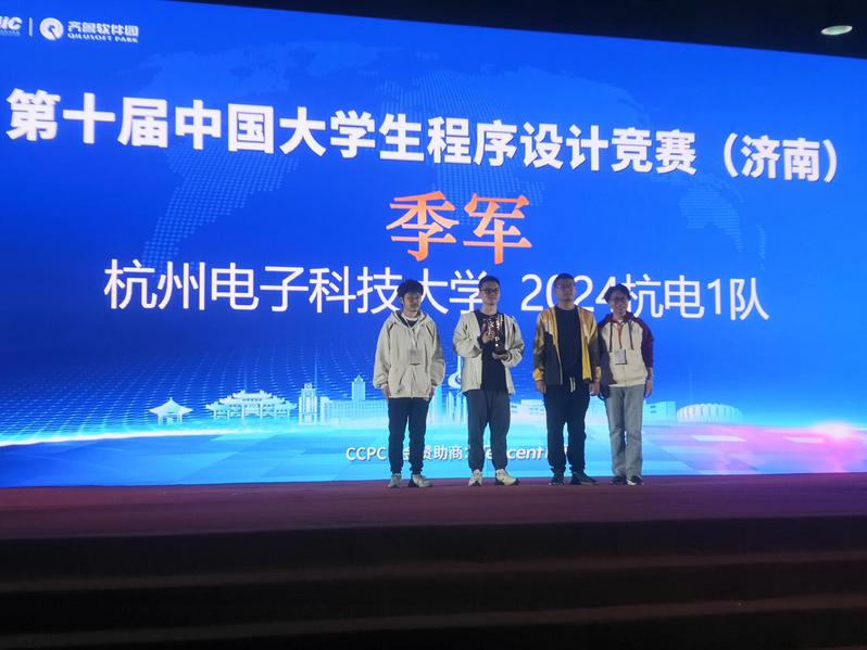 本次CCPC济南赛区的比赛我校共有3支队伍入围,除了获得季军的队伍以外,由卓越学院2023级王佳栋、卓越学院2023级刘亿臻、卓越学院2023级吴启航组成的“2024杭电7队”,计算机学院2022级蔡炜权、计算机学院2022级许思杰、卓越学院2022级范宇航组成的“2024杭电5队”也分别获得银牌和铜牌的好成绩。