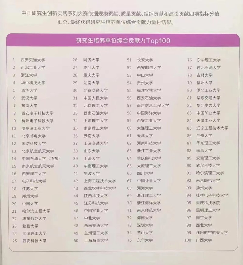 在总结大会上,中国学位与研究生教育学会重点发布了《中国研究生创新实践系列大赛十年发展报告》。报告全面回顾了大赛十年发展历程,从不同维度,全面分析了大赛十年发展数据,公布了十年发展贡献力排行榜与大赛参赛师生问卷调查分析报告。中国研究生创新实践系列大赛依据规模贡献、质量贡献、组织贡献和建设贡献四项指标分值汇总,最终获得研究生培养单位综合贡献力量化结果,我校位列全国研究生培养单位综合贡献力Top100榜单第9位,位居浙江省省属高校第1位。