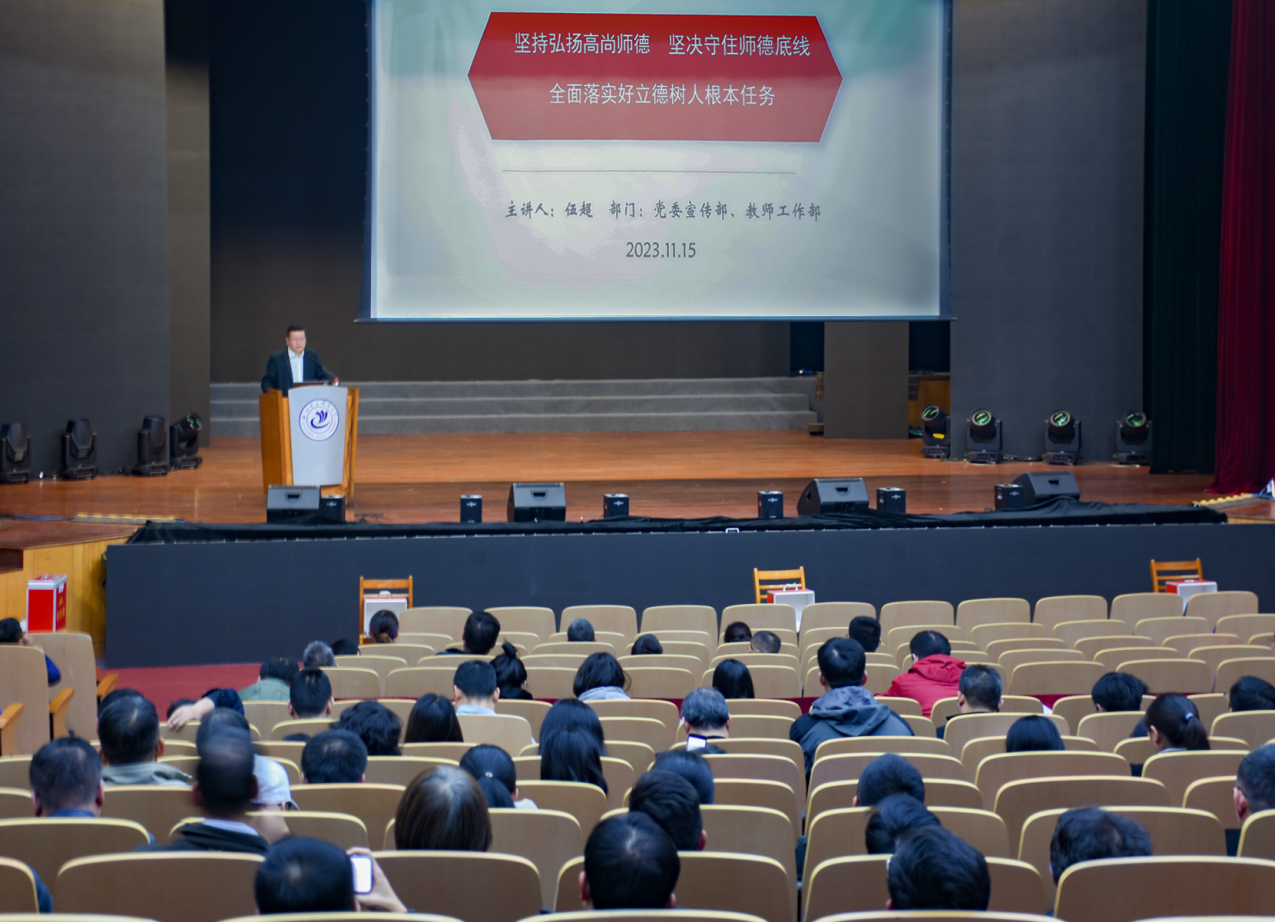 11月15日下午,计算机学院在学生活动中心剧院举行以“厚廉洁文化土壤、打造清廉学校新高地”为主题的师德师风暨廉政文化教育大会。学院邀请了宣传部副部长伍超为全院教职工开展师德师风教育,会议由学院党委书记孔万增主持,学院党政领导班子、全体教职工参加会议。