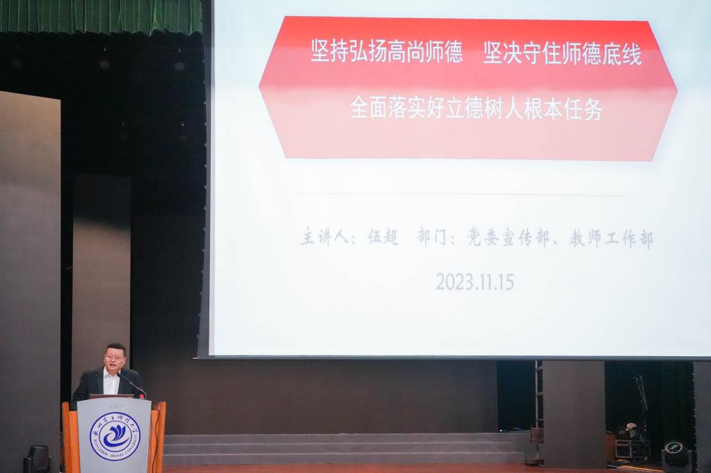 会议伊始,伍超向参会教职工通报了近期教育部公开曝光违反教师职业行为十项准则典型案例,对违法违纪的典型案例进行分析,通过以案明纪,教育引导全体教职工从典型案例中吸取教训,严守底线、不碰红线,自觉抵制师德失范行为,树立高尚的师德修养和敬业精神,共同努力营造风清气正的教书育人环境。强调廉洁文化在学校发展中的重要性。他指出,作为教师,应时刻保持教书育人的职业操守,树立正确的世界观、人生观、价值观,用自己的实际行动影响和带动学生,共同营造风清气正的学习环境。