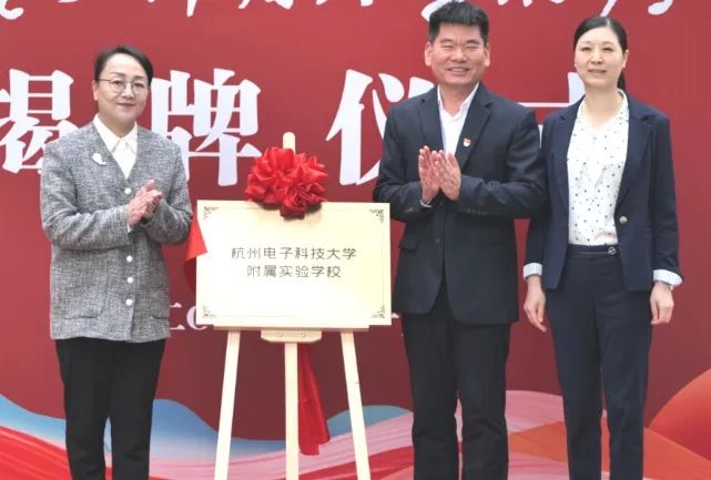 校党委副书记钱波,钱塘新区管委会副主任、钱塘区人民政府副区长潘伟红,为杭电附属第一小学、附属中学、附属实验学校、附属景澜幼儿园揭牌。