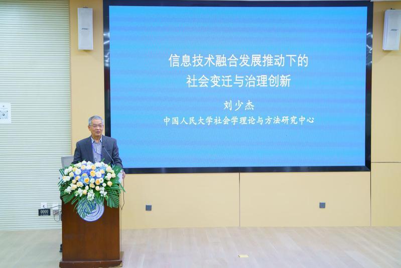 中国人民大学社会学理论与方法研究中心主任、《社会学评论》主编刘少杰教授做了题为“信息技术融合发展推动下的社会变迁与治理创新”的主旨报告。刘教授分别从日新月异的信息技术融合发展、城乡阶层群体结构的广泛变迁、城乡居民思维方式的深刻变迁这三个角度来分析了数字智时代背景下的社会治理的前景和挑战,并在最后强调我们应该直面具体、避免空谈;回归生活、追求真实。