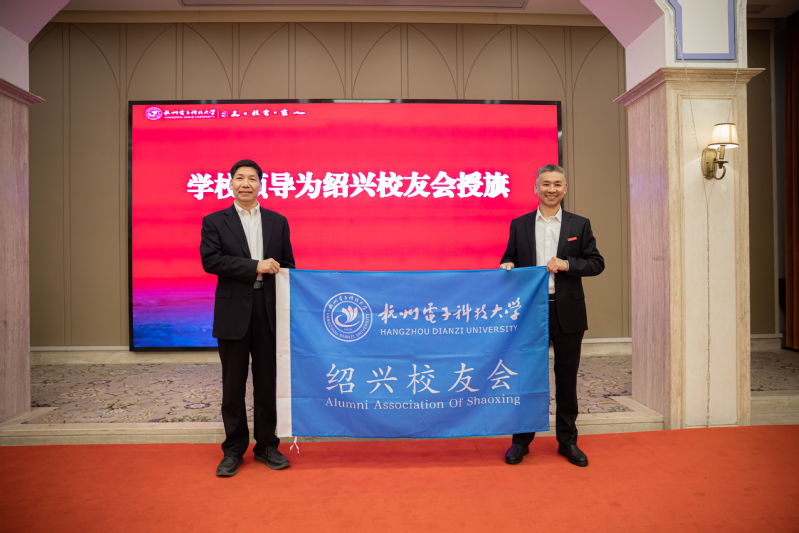 吕金海宣布杭电绍兴校友会成立并授会旗。新任会长丁国兴分享了自己在母校的求学经历和毕业后的工作经历,感恩母校对自己的培养,感谢周子学学长对自己的无私帮助,感谢绍兴校友会筹备组的辛勤工作和母校对绍兴校友会的鼎力支持。最后,他表示将带领绍兴校友会齐心协力为母校冲击“双一流”高校奋斗目标贡献更多绍兴校友力量!
