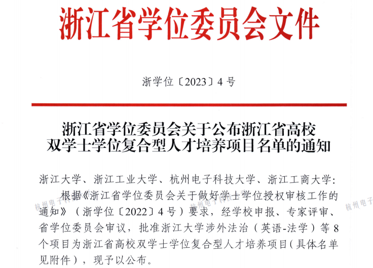 近日,浙江省学位委员会发布了《关于公布浙江省高校双学士学位复合型人才培养项目名单的通知》(浙学位〔2023〕4号),全省4所高校8个双学士学位复合型人才培养项目获批,我校金融数据科学(金融学+计算机科学与技术)、安全技术与数智化管理(保密管理+信息安全)2个项目名列其中。