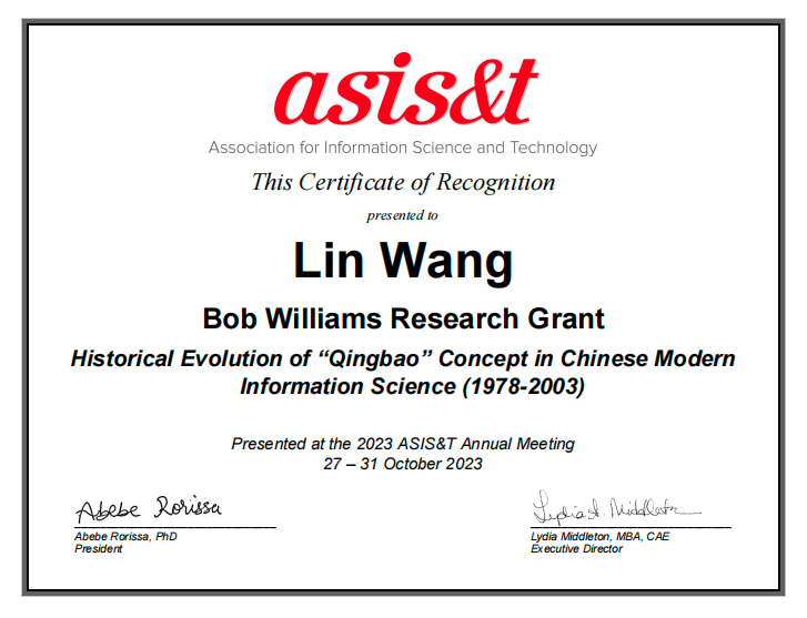 日前,第86届国际信息科学与技术学会年会(86th Annual Meeting of the Association for Information Science & Technology—ASIS&T2023)在英国伦敦举行。会上颁布了本年度各奖项的获奖名单。我校中国科教评价研究院副院长、特聘教授王琳荣获BobWillams研究基金奖。他也是该奖项成立以来首位来自中国图书情报与档案管理的获奖者。