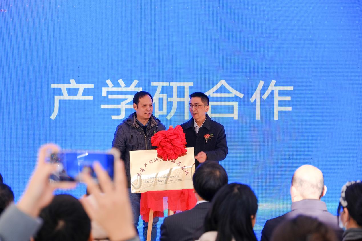 伴随着现场的掌声,校企合作授牌仪式也正式开始,人文艺术与数字媒体学院、法学院院长王毅刚与后勤服务中心党委书记、主任王劲峰共同为国际交流中心校区合作项目揭牌。揭牌仪式结束后,与会领导和嘉宾上台启动开业仪式,国际交流中心从此刻起正式开业。