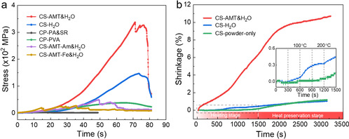 图4(a)不同冷烧结工艺和配方制备的复合材料的抗压曲线(b)冷烧结过程中的压缩曲线
