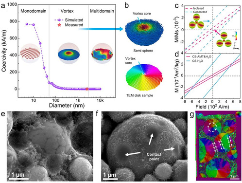 图2(a-b)颗粒尺寸、磁结构、矫顽力之间的关系(c-d)相互接触和隔离的磁涡旋结构的磁滞回线(e-f)相互隔离与相互接触的颗粒的显微图片(g)独立的磁涡旋结构与相互接触的磁涡旋结构的DPC图像