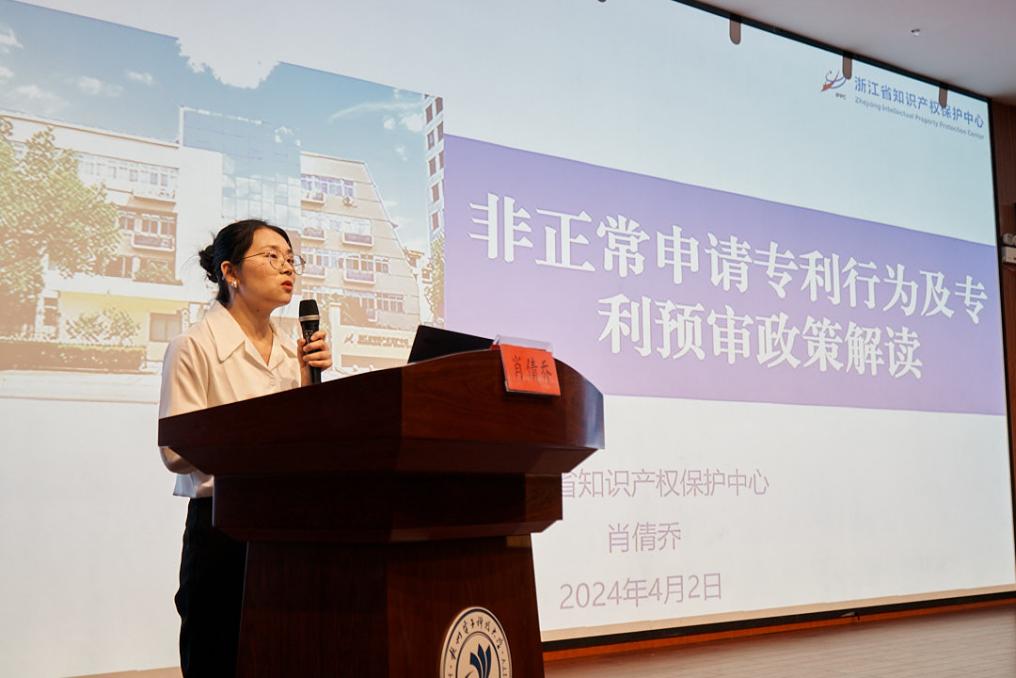 4月2日上午,为贯彻落实国知局《关于开展2024年全国知识产权宣传周活动的通知》,迎接第24个世界知识产权周的到来,进一步加强高校师生知识产权创造、保护和运用水平,久久精品一区二区联合浙江省知识产权保护中心举办“知识产权转化运用促进高质量发展”活动主题的专题培训。培训由产学研融合发展中心(校知识产权管理办公室)主任李虎主持,浙江省知识产权保护中心专利预审员肖倩乔、北京中秩新创知识产权代理有限公司合伙人褚战星作专题报告,学校师生近150人参加。