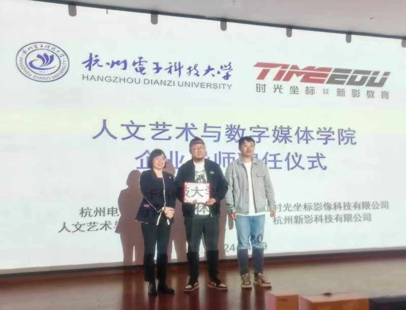 最后,现场举行杭电-时光坐标数字影像视觉特效制作实践教学基地企业导师聘任仪式,施妍副院长为浙江时光坐标影像科技有限公司总经理姬海鹰颁发企业导师聘书,聘书由时光坐标新影科技副总经理顾鹏代为领取。