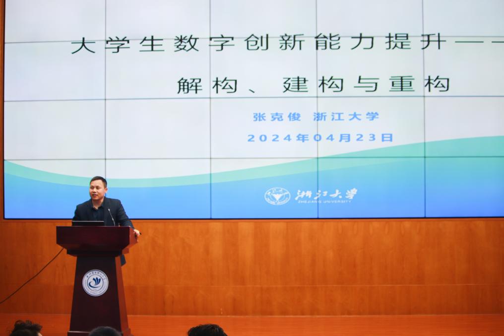 随后,来自浙江大学计算机科学与技术学院的张克俊教授进行了《大学生数字创新能力提升——解构、建构与重构》讲座,内容深入浅出,在众多听众之中激起深刻的反响。