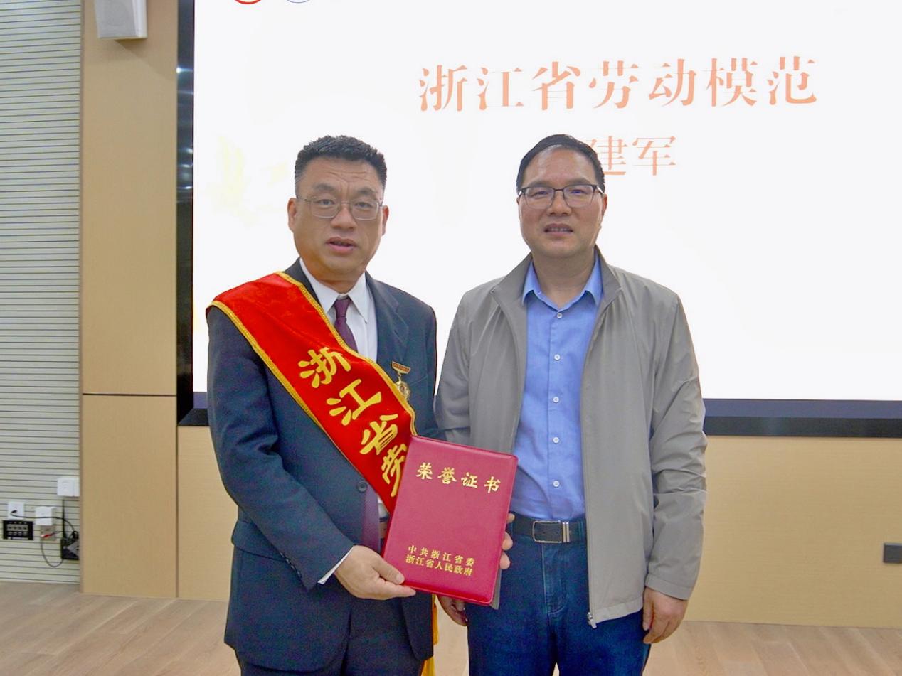 骆建军在表彰大会上发言。他表示,荣获浙江省级劳动模范称号是对他过去工作的肯定,也是对他未来工作的期许。作为第一批杭电培养的集成电路博士,他感谢国家和学校对他研究提供的支持,他将积极参与科研和社会服务活动,推动学术成果的应用和推广,为社会的发展贡献更多的智慧和力量。骆建军教授勉励大家要为满足国家重大战略需求而努力,用好“劳动”这项最大的资源,用自己辛勤的劳动创造最大的资源。