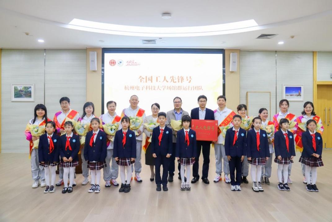 王玉庆对获得“全国工人先锋号”的学校场馆群运行团队和浙江省劳动模范表示热烈的祝贺,并为获奖代表佩戴绶带,颁发奖牌和证书。场馆群运行团队副指挥长钱波、吕金海带领部分领域主任,浙江省劳动模范骆建军接受表彰。附属第一小学少先队员向获奖代表献花。