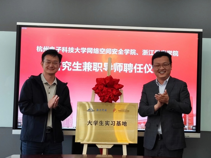 网络空间安全学院赵治栋院长在会上聘任周小蕾总经理和杨兴副总工程师为网络空间安全学院研究生兼职导师,这不仅是对两位专家专业能力的认可,也为双方的合作增添了新的活力。此外,任一支副院长和杨兴总工程师共同为“杭电-西力大学生实践基地”揭牌,为双方的实践教学和人才培养提供了有力支持。