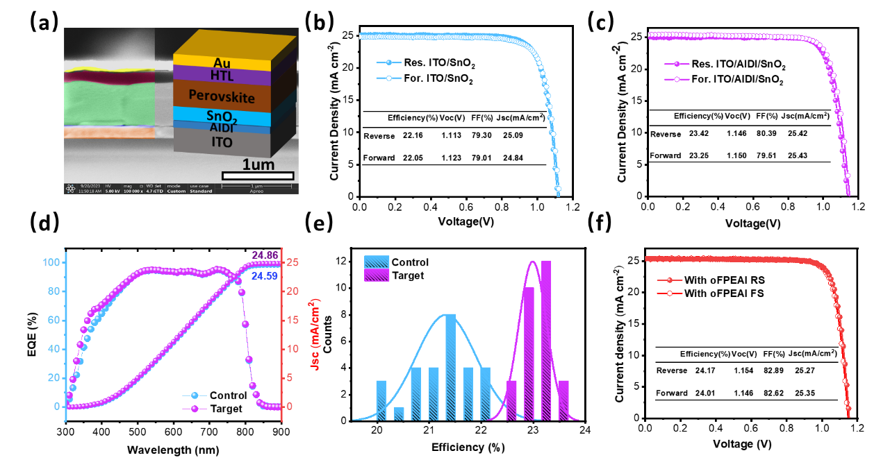 图1. (a)钙钛矿太阳能电池的SEM截面和插图。(b)、(c)分别为(Target)和w/o (Control) AIDI时PSCs的电流密度-电压曲线,(d) EQE图谱,(e) PCE分布。(f) oFPEAI钝化后优化器件的J-V曲线。