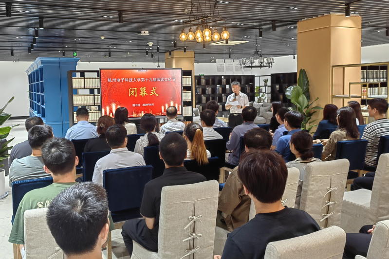 颜成钢在致辞中感谢大家前来参加今天的闭幕式,感谢阅读文化节期间参与活动的师生们。他简单回顾总结了本次阅读文化节活动的四大鲜明特点。第一,活动类型有广度。阅读文化节有主题书展、读书沙龙、摄影大赛、找书大赛、数字资源游园会等众多活动和比赛。项项是精品,总有一款适合你。第二,活动内容有深度。如雕版印刷体验与讲座活动,展示清代、民国、现代的雕版、活字模以及一批明、清、民国线装古旧书,让师生们亲手操作雕版印刷,切身感受中国传统文化的独特魅力。第三,活动参与有深度。过刊折价活动时间历时两天,共卖出杂志69种918册,活动受到师生读者好评,“过刊折价买,知识不打折!”“期刊会过期,知识不过期”!另外,为充分发挥过刊的知识流转价值,图书馆将未售完的53种、831册过刊无偿赠送给自动化学院、后勤集团、离退休处等部门。人文艺术学院高诚老师的《从塞尚到无极——抽象艺术的发展和欣赏》的讲座现场反应热烈,希望图书馆能多开展此类高雅的艺术欣赏与讲座。面向全校师生员工的主题为“浮光魅影•醉书海”的摄影大赛师生参与面广,参赛作品质量较高,展现了摄影师们的精湛技艺和独特视角。第四,活动影响有力度。在力行书屋举办的“喜迎党代会 阅进新征程”主题书展和阅读留言打卡活动,得到了校党委书记吴卿,校党委副书记钱波等校领导的高度评价。他指出,习近平总书记在党的二十大报告中提出,教育、科技、人才是全面建设社会主义现代化国家的基础性、战略性支撑,高等教育是科技第一生产力、人才第一资源和创新第一动力的融合交汇点。高等教育的一个核心使命就是高质量人才培养。当前杭电正在全力建设“双一流”高校。为此,面对新形势新要求,杭电图书馆必须超前识变、主动应变、积极求变,加快图书馆现代化转型,完善学术文献资源保障体系,全面提升资源质量和服务水平,主动融入“双一流”高校建设的新征程中,将图书馆建设成文化育人、滋养心灵的重要场所,把图书馆打造成杭电师生的精神高地和校园文化地标,为学校实现更高层次、高质量的发展做出应有的贡献。