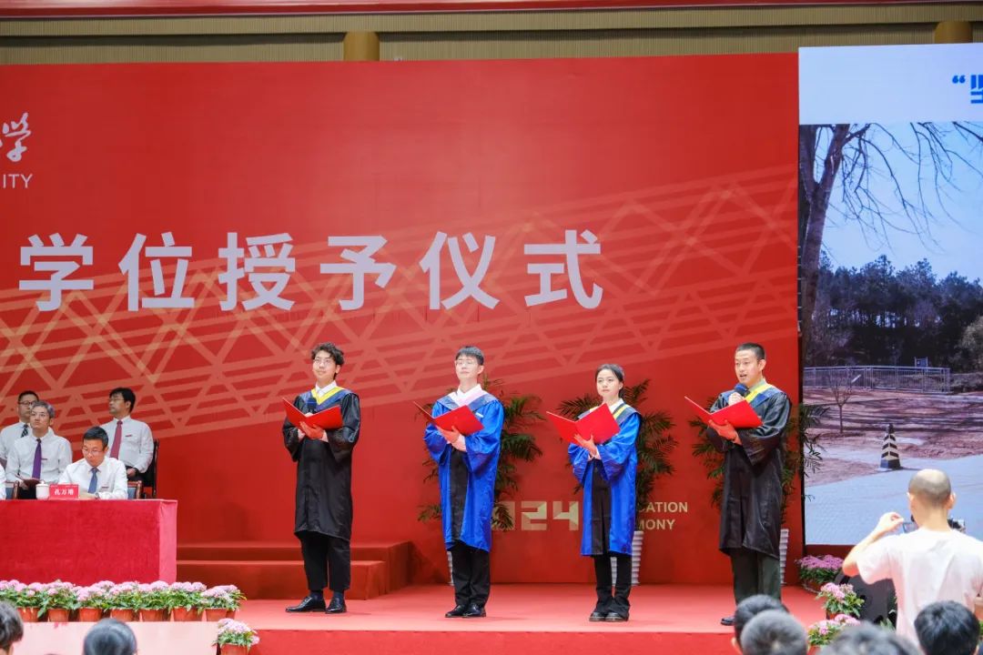 毕业生代表自动化学院王蕴宁,管理学院汪孝健,人艺数法学院丁婉珈,电子信息学院张煜培,卓越学院赵政和,经济学院童暄涵,计算机学院徐盛文卓,国际教育学院默罕默·德咖立德·哈桑上台献词。