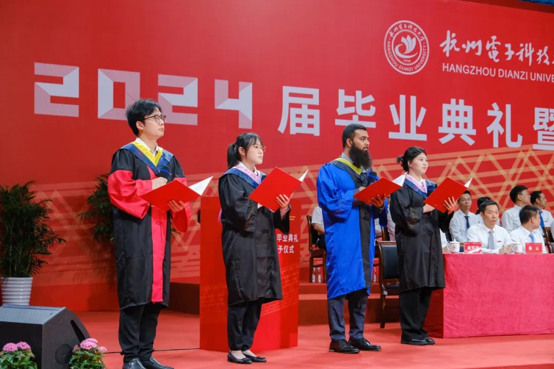 “西子湖畔启航,钱塘潮头破浪。笃学力行,志在远方。守正求新,日月华光。忠诚家国担大任,放眼世界竞自强。” 最后,典礼在《杭电之歌》中圆满结束。