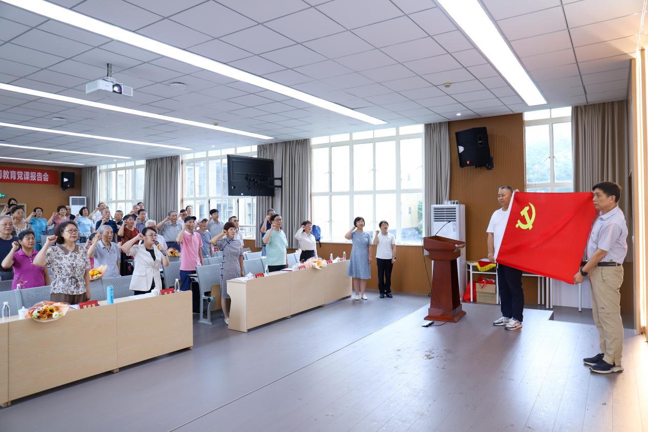校党委副书记钱波为新退休党员代表佩戴党徽,赠送党章,带领与会党员重温入党誓词。
