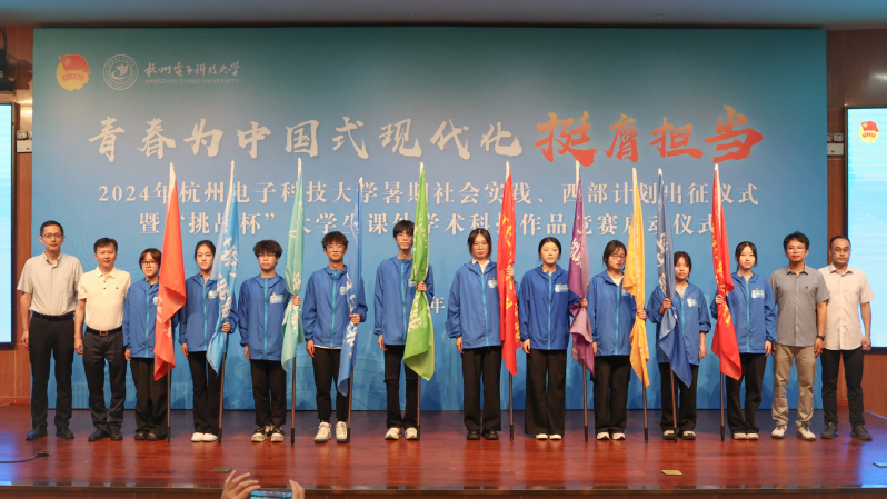 学工部、教务处、研工部、后勤服务中心相关负责人向参加今年暑期社会实践理论普及宣讲、红色基因传承、乡村振兴和共同富裕、发展成就观察、民族团结、生态文明实践、文明新风与反邪教宣传、科技创新、模拟政协提案、“我为资助代言”10大主题实践的学生代表授旗。
