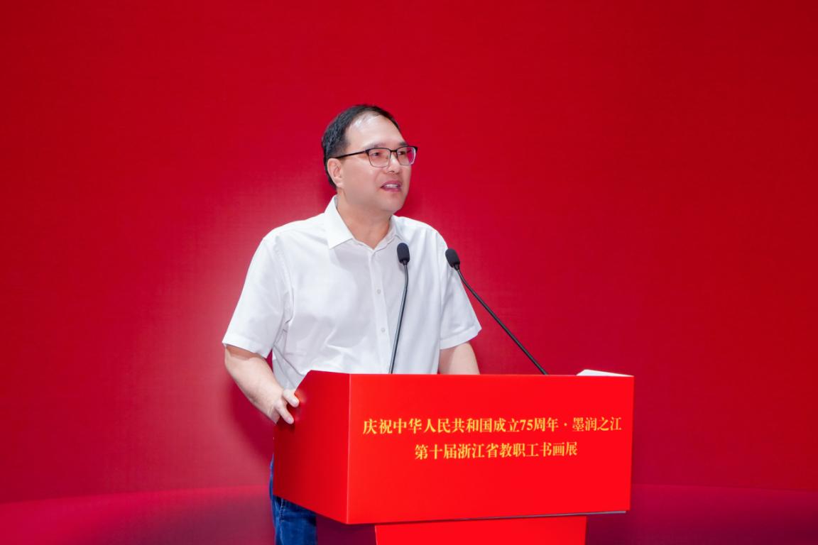 9月30日,“庆祝中华人民共和国成立75周年∙墨润之江”第十届浙江省教职工书画展在下沙校区体育馆隆重开幕。浙江省总工会常委、二级巡视员,省教育工会主席王玉庆、校党委书记吴卿、省教育书法协会会长黄建新、校党委副书记钱波、原副校长吕金海,学校办公室、宣传部、学生工作部、工会、团委、妇联、联络发展中心、教学质量检测与评估中心、材环学院、人艺数法学院、马克思学院、校教职工书画协会等单位负责人出席开幕式并观展。来自全省各地的三百余名师生齐聚一堂,共庆中华人民共和国成立75周年。