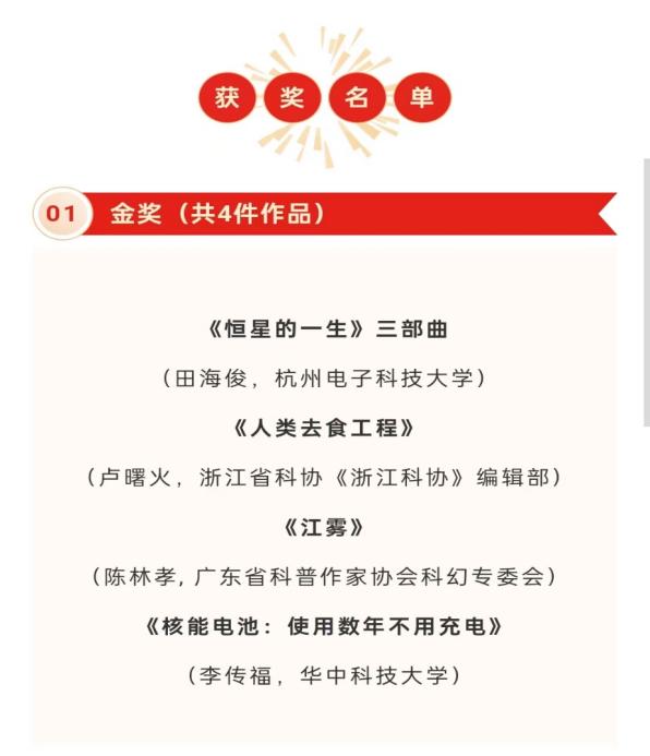 10月12日,浙江省科普联合会公布了首届浙江科学传播大赛科普科幻赛道优秀作品获奖名单,经过专家评审共评出金奖4名,银奖8名,铜奖12名以及优秀组织奖2家。我校理学院田海俊教授的《恒星的一生》三部曲在众多参赛作品中脱颖而出,获得金奖。