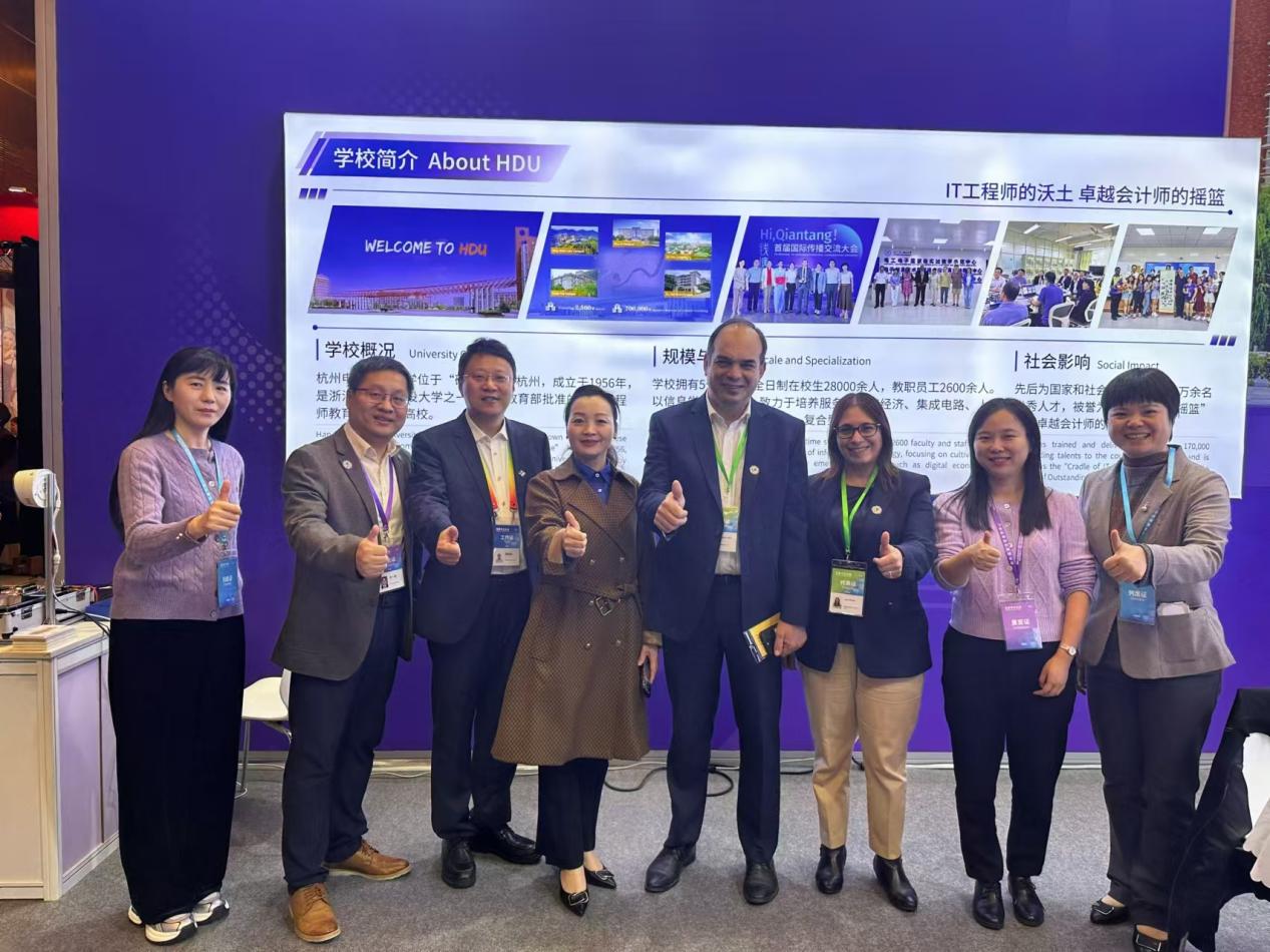 此外,我校塞浦路斯理工大学孔子学院外方院长和塞浦路斯理工大学校长也到达展厅,这是他们首次受邀来华参加这一国际中文教育领域的盛会。杭电塞理工孔子学院自2023年正式获批以来发展迅速,作为我校国际中文教育的重要窗口,积极推广中文教育和中华文化,区域影响力不断提升。