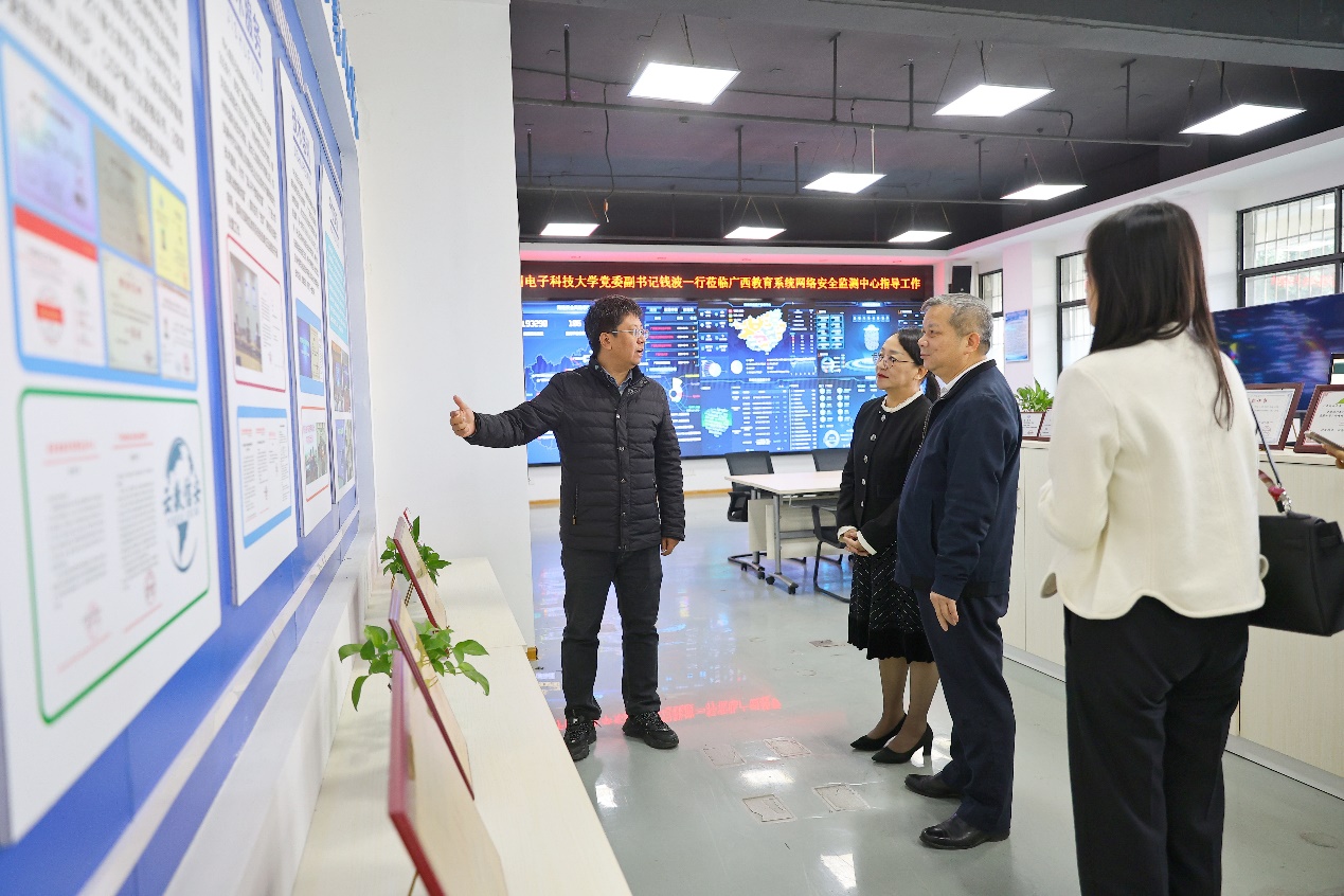 钱波一行和桂林电子科技大学党委副书记陈贵英、广西科技大学党委副书记张发钦以及两校相关职能部门负责人、青年科学家代表参加沙龙。三校青年科学家们分享科创经历、探讨融合创新,聚焦如何做更好的科研、如何更好地服务地方经济社会发展进行了广泛交流和探讨。随后,一起考察了广西教育系统网络安全检测中心。