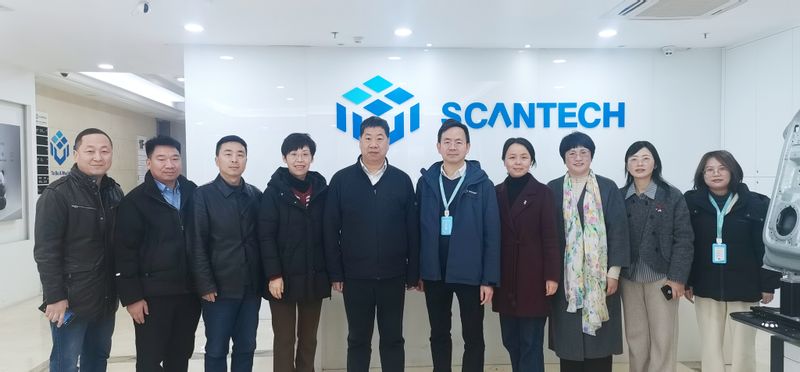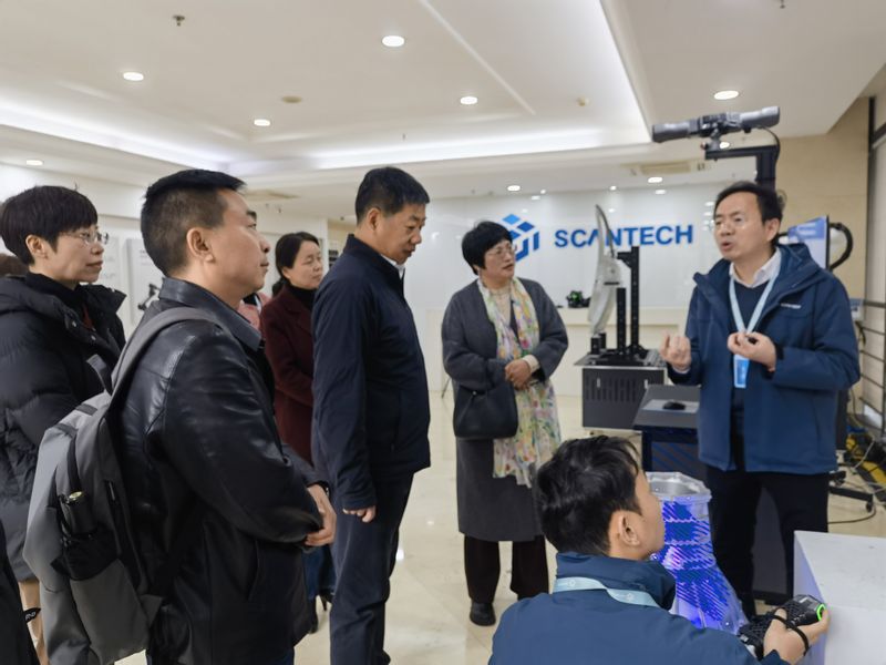 在王江峰等校友的陪同下,马国进一行首先参观了思看科技产品展厅。作为全球三维视觉检测领域的领军企业,思看科技自主研发的高精度3D扫描仪、智能检测系统等产品广泛应用于工业制造、航空航天、文化遗产数字化等领域。王江峰现场展示了核心技术的实际应用场景,其创新成果和行业影响力令母校来宾频频称赞。