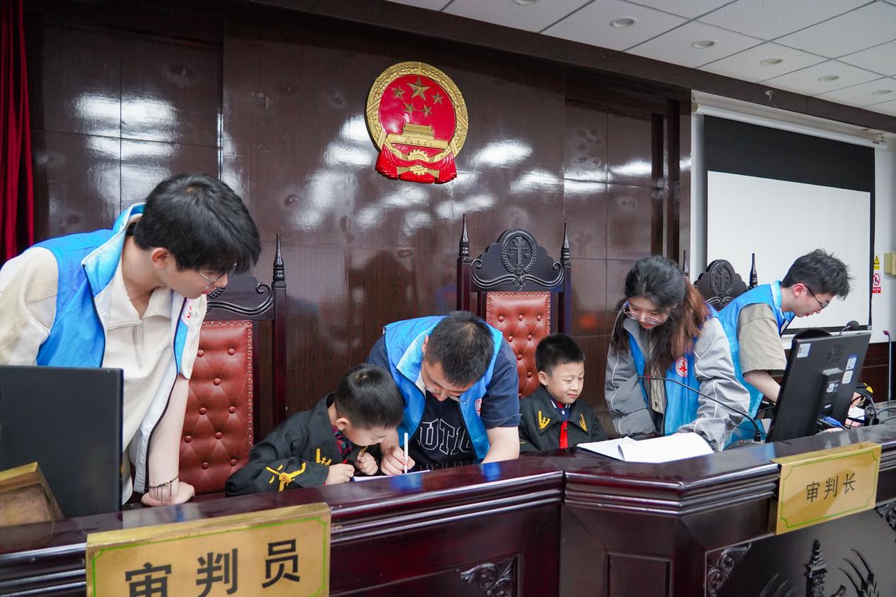 “现在开庭!”随着“小法官”稚嫩而庄重的宣告声,一场别开生面的模拟法庭活动在法学院模拟法庭教室拉开帷幕。杭电宝贝们沉浸式体验庭审流程——从“公诉人”铿锵有力的指控,到“辩护人”据理力争的陈述,再到“法官”庄严的宣判,每一个环节都生动还原真实法庭场景。在浙大法学教授和我校法学院志愿者学生的指导下,杭电宝贝们学习法律知识,感受法治精神,更深刻理解了“以法制暴”的意义。这场别开生面的普法课堂,让法治意识在儿童心中生根发芽。