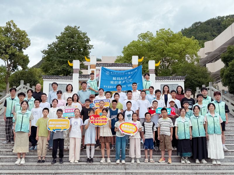 在丽水市莲都区老竹民族学校实践点,戚明钧一行看望计算机学院“解码AI未来,编织畲乡记忆”调研实践团,观摩《AI畲族剧本创作》、《科学实验课》等特色课程现场教学,并认真听取团队实践情况汇报,对成员们充分利用专业知识惠及乡村课堂给予充分赞赏。