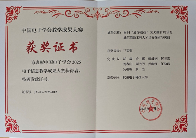 7月26日,在成都举行的中国电子学会2025电子信息教学成果大赛颁奖典礼上,通信工程学院申报的两项教学成果从全国212项参赛作品中脱颖而出,分获全国二等奖和三等奖,充分彰显了学院在电子信息教育领域的创新实践与育人实力。