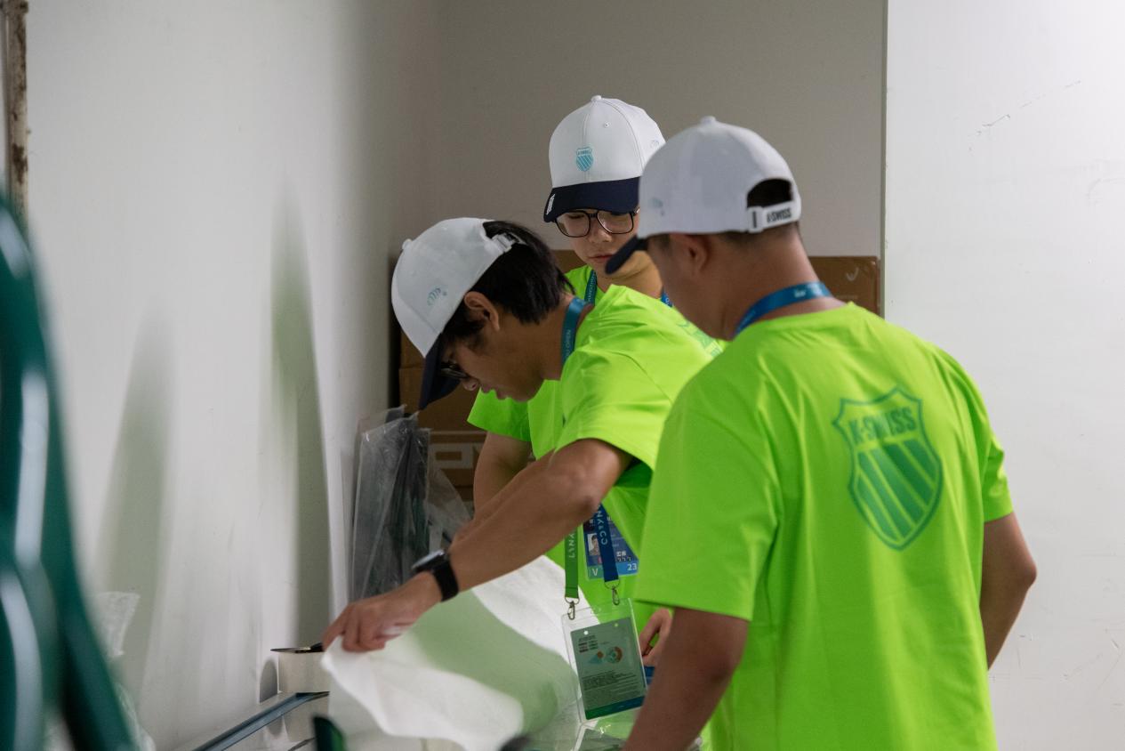 开赛第一天早上,“小青荷”们已整装待发。烈日下的网球赛场上,场地服务领域的志愿者们全力以赴,挥汗如雨。他们在演练中准备比赛物资,随时补充,帮助球员在局间有效恢复体力。紧张赛程中,来自卓越学院的李卓曦和运动员们同样心如擂鼓,他在赛后流着汗分享:“从搬运物资到布置场地,每一个环节都充满了新的挑战;汗水背后,是团队协作的温暖和赛事顺利启幕的成就感,正是这些看似微不足道的瞬间,让我真切体会到志愿服务中最真挚的感动与力量。”