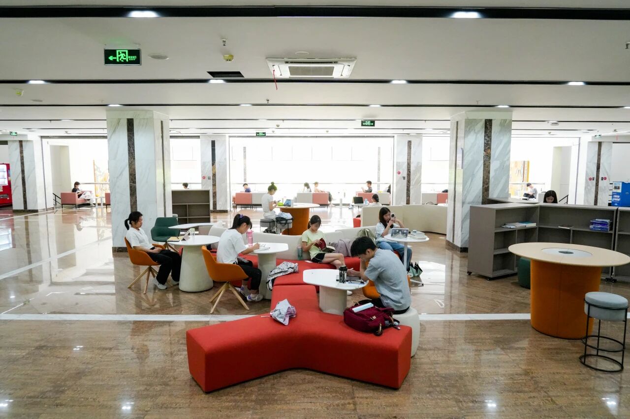 大楼上的“图书馆”三个铜字经过清洗后显得更加熠熠生辉!在二楼东自修室全新设置了敞亮的照明、舒适的座椅和阅读桌。在二楼北区域建成了可容纳50人左右的学术活动室。三楼打造了休闲小憩舒适区。四楼按照轻中式风格进行重点打造。六楼重点打造了10间大小不一的讨论间。每个讨论间均配备有隔音和独立空调系统。