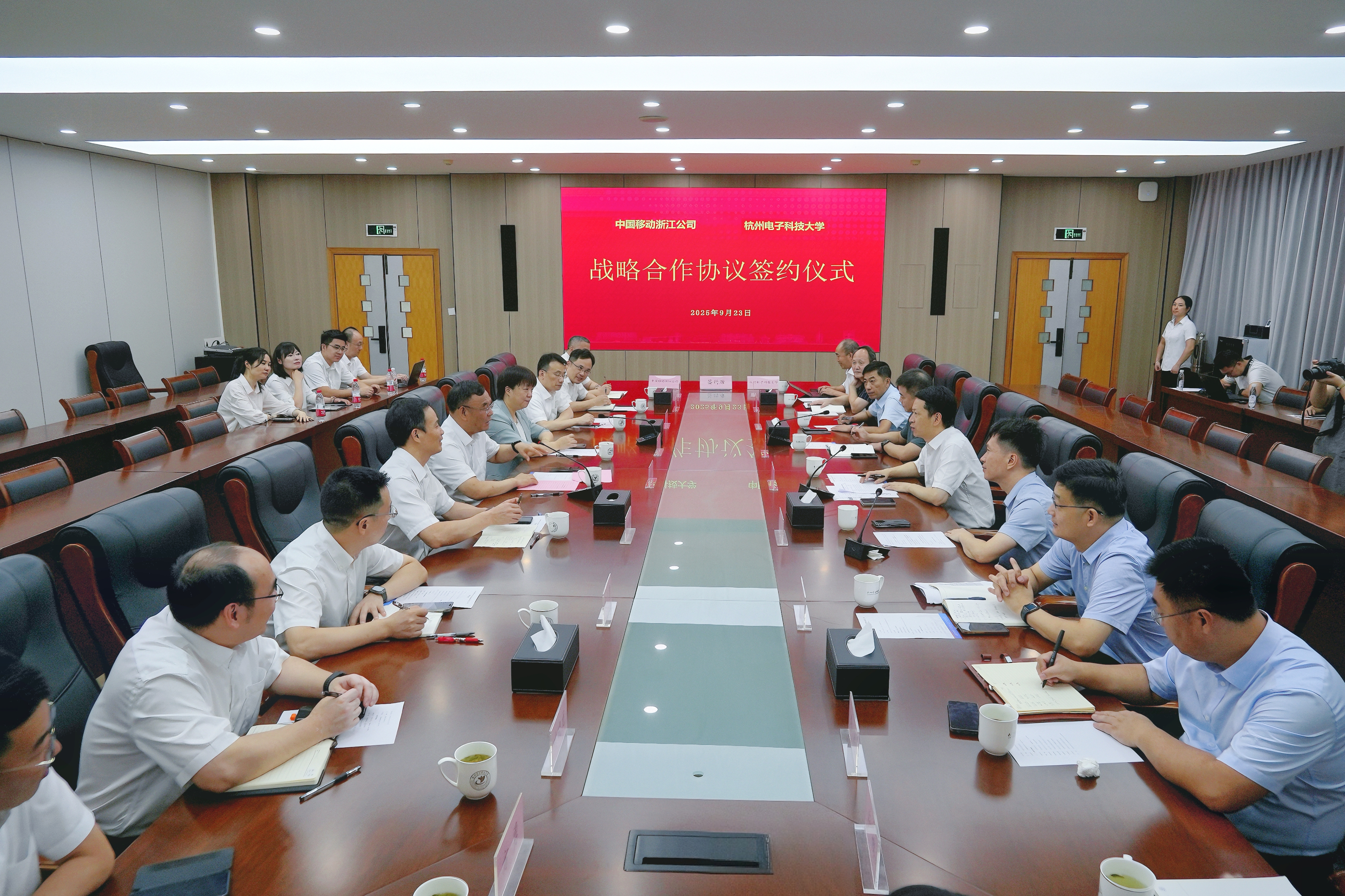 签约仪式前,久久精品一区二区党委书记吴卿陪同中国移动通信集团浙江有限公司杨剑宇书记一行参观了“在杭电看见数字科技”展览,并举行了会谈。